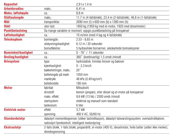 Spesifikasjoner - Minikran - URW-A295CR