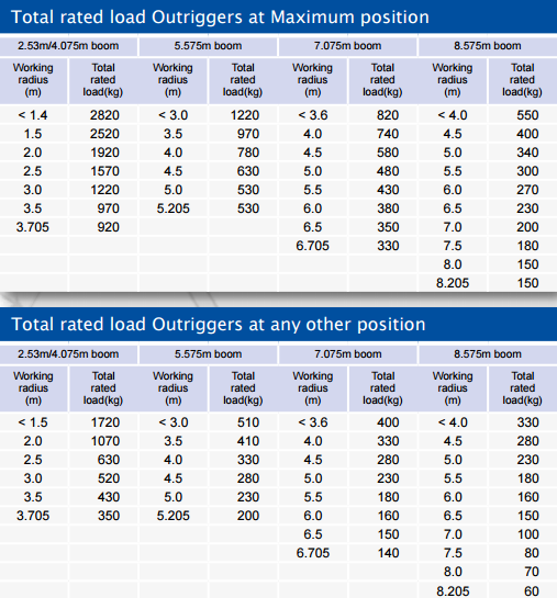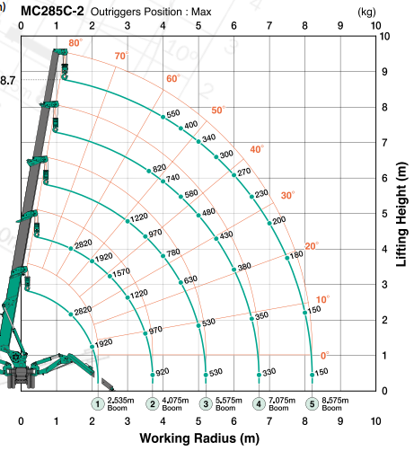 | Spesifikasjon | | Krankapasitet | 2,82 t x 1,4 m | | Maks. arbeidsradius | 8,205 m x 150 kg | | Maks. løftehøyde | 8,7 m x 550 kg | | Krokhastighet | 8 m/min. (4 blokker, 4. lag) | | Enkeltlinjehastighet | 32 m/min. (4. lag) | | Heiswire | IWRC 6 x Fi (29) Ø 7 mm x 48 m | Teleskopisk system Bomlengde Teleskophastighet Bomtype | 2,535 m - 8,575 m 6,04 m / 22 sek. Helautomatisk 5-delt pentagonal teleskopisk bom | Bom-heisesystem Heisevinkel/-hastighet | 0 - 80º / 14 sek. | Dreiesystem Dreievinkel/-hastighet | 360º kontinuerlig / 2,3 o/min | Utriggersystem Type