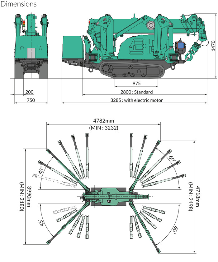 Overvind-beskyttelse, vinkelindikator, hydraulisk sikkerhetsventiler, stålvaier latch, nivå, hellingsalarm for maskin, EMO switch, arbeidsstatuslampe, datalogg, kran og utrigger låsenhet | | Tilleggsutstyr | Alle tillegg |