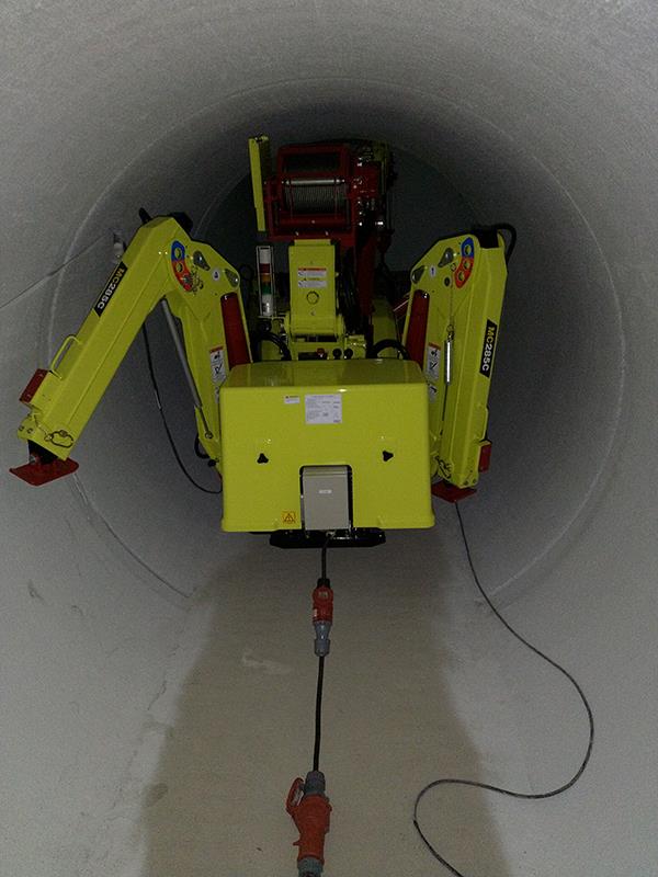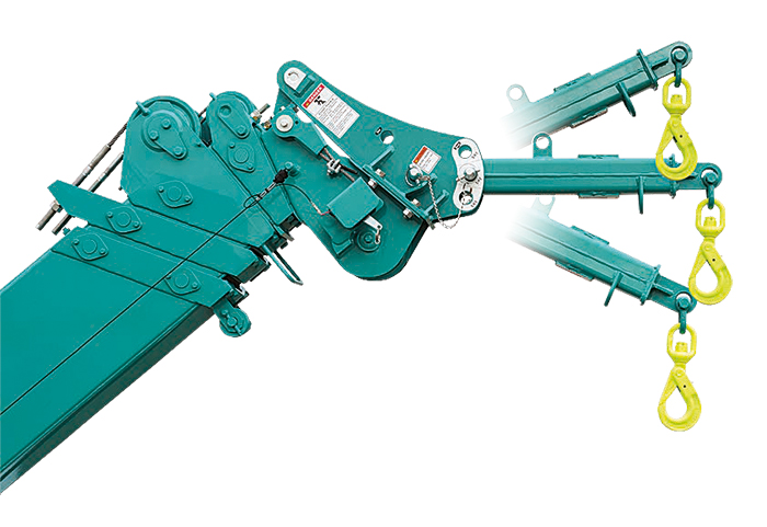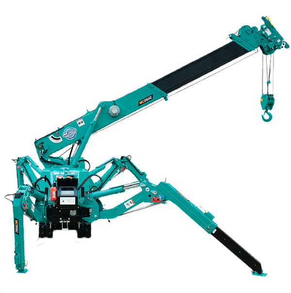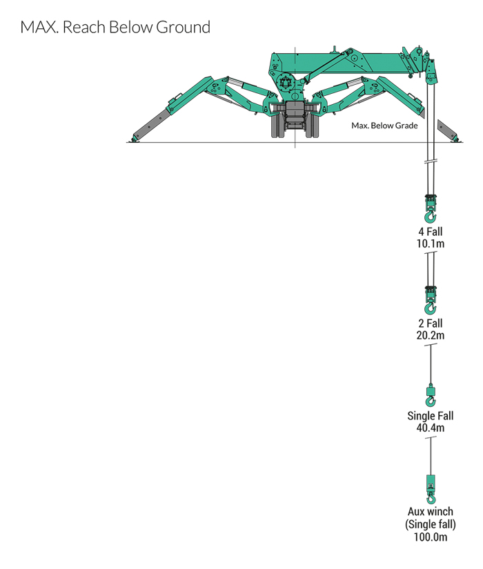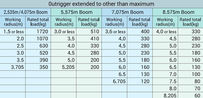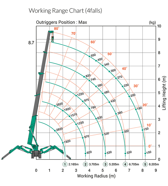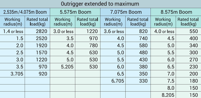 | Spesifikasjon | | Krankapasitet | 2.82t x 1.4m | | Maks. arbeidsradius | 8.205m X 0.15t | Maks. løftehøyde bakke -under bakkenivå - under bakkenivå m/hjelpevinsj | 8,7 m x 550 kg -10,1m -100m (enkeltfall) | | Krokhastighet | 9.3m/min (4 blokker, 4. lag) | | Enkeltlinjehastighet | 32 m/min. (4. lag) | | Heiswire | IWRC 6 x Fi (29) Ø 7 mm x 48 m | Teleskopisk system Bomlengde Teleskophastighet Bomtype | 2,535 m - 8,575 m 6,04 m / 22 sek. Helautomatisk 5-delt pentagonal teleskopisk bom | Bom-heisesystem Heisevinkel/-hastighet | 0 - 80º / 14 sek. | Dreiesystem Dreievinkel/-hastighet | 360º kontinuerlig / 0.88rpm | Utriggersystem Type