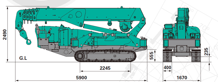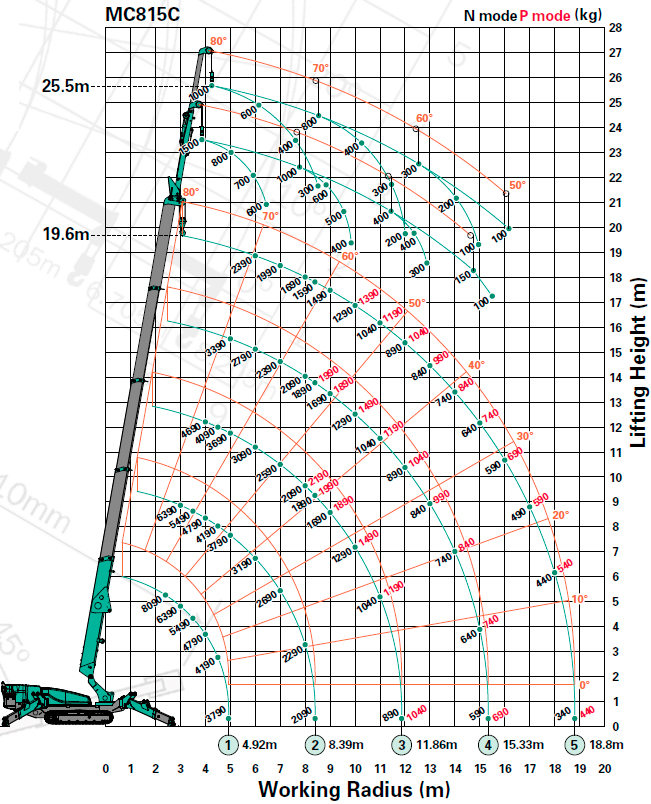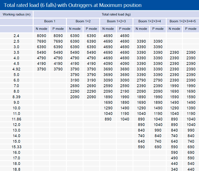 | Spesifikasjon | | Krankapasitet | 8.09t x 2.4m | | Maks. arbeidsradius | 18.8m x 340kg | | Maks. løftehøyde | 19,6m x 2390kg (25,5m x 1000kg) | | Krokhastighet | 20.6 m/min. (4 blokker, 6-lags) | | Enkeltlinjehastighet | 123.6 m/min. (4-lags) | | Heiswire | IWRC 6 x Fi (29) Ø 10mm x 150m | Teleskopisk system Bomlengde Teleskophastighet Bomtype | 5.52m – 19.4m 13.88m/52 sec Helautomatisk 5-delt pentagonal teleskopisk bom | Bom-heisesystem Heisevinkel/-hastighet | 0 - 80º / 22.9 sek. | Dreiesystem Dreievinkel/-hastighet | 360º kontinuerlig / 2,5 rpm | Utriggersystem Type