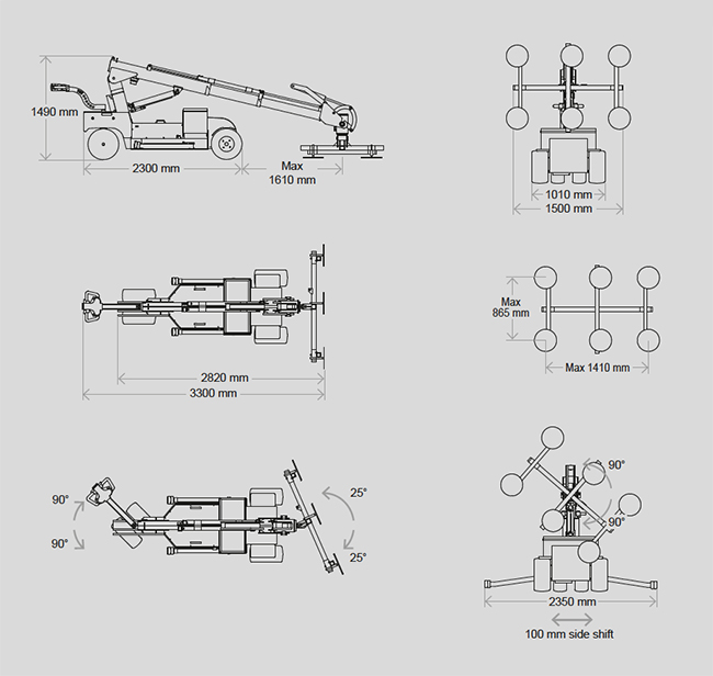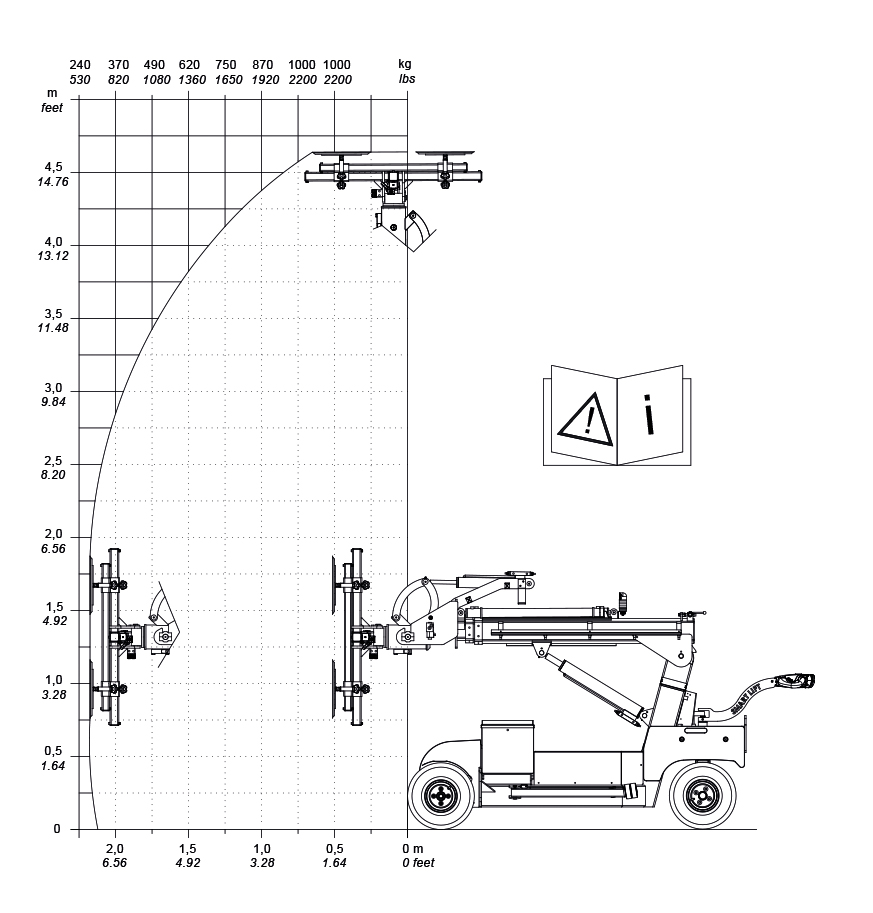 | Tekniske spesifikasjoner: | | Løftekapasitet arm inntrukket/utstrakt | 1,000 / 280 kg - 2,200 / 620 lbs. | | Løftehøyde: | 4,400 mm / 173 in. | | Armforlengelse: | 2 x 830 mm / 2 x 33 in. | | Spissen fra horisontalen | 42o back / 86o fwd | | Sideforskyvning | 100 mm / 4 in | | Ladespenning | 230V / 110V | | Ladetid | Approx. 8 hrs. | Batteri | 4 x 134 Ah AGM | | Batterikapasitet: | Up to 8 hrs. | Fremhjulsdrift | 2000 W AC | | Sugekopper: | 6 x Ø400mm / Ø16 in. | Egenvekt | 1,300 kg / 2,866 lbs. | | Klasse | IP 65 |